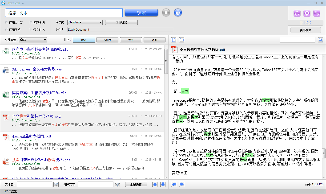 主界面右上方有三个按钮,分别用于“快速扫描”,“设置”和“注册”。 其中,“快速扫描”仅适用于区域模式。如果很久没有打开TextSeek,之前预扫描的内容可能过期了,点击此按钮可快速扫描一遍。