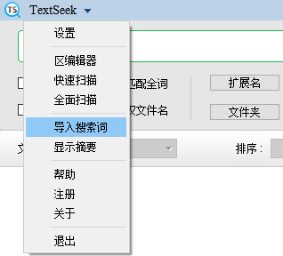 点击顶部的TextSeek,可以看到菜单栏,此处有两个小功能:导入搜索词,隐藏/显示摘要。前者可以选择一个搜索词文件,直接读取作为搜索词,如果这个文件有多行,则用“or”将每行的词分开。对于频繁使用的超长搜索词,导入搜索词功能可提高效率。