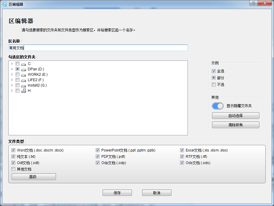 这是单个区的设置页面。 你可以指定区名称,勾选要搜索的文件夹和文件类型(可单击右侧的“显示隐藏文件夹”以显示所有文件夹)。此处允许勾选多个文件夹,右边有个“自动选择”按钮还可以帮你智能勾选一些常用文件夹。如果你需要的文件类型不在列表中,请单击“高级”以进一步操作。
