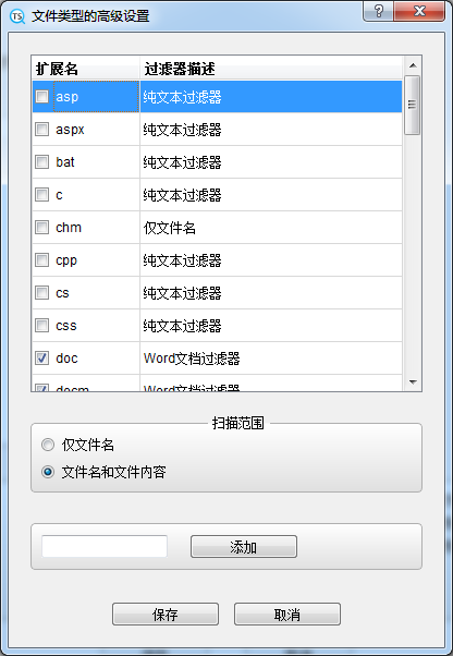 接下来介绍文件类型的高级设置页面。 上面的表格为文件后缀表,一行代表一种文件后缀。单击一行,可选择扫描范围为“仅文件名”或“文件名和文件内容”。在下面你可以添加新的文件后缀,只需输入文件后缀,然后按“添加”按钮。 用户添加类型的文件将被解析为纯文本文件。 单击“保存”将保留所有更改。