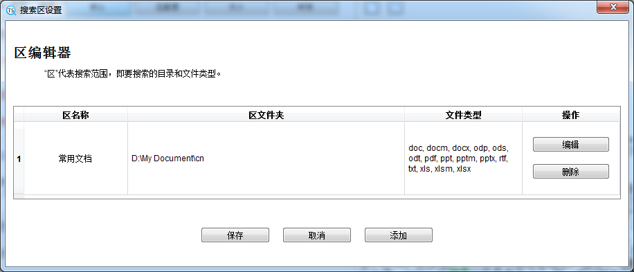 区域模式中,增加了一个“区编辑器”的按钮。打开“区编辑器”,所有区的信息都显示在表格中,一行即一个区(默认行是你在向导页面中设置的区)。你可以单击“编辑”以修改区,或单击“添加”以增加一个新区。设置完区后,单击“保存”以执行区的扫描。