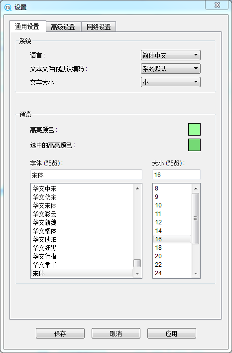 这是“设置”窗口。 第一个标签页是“常规设置”,你可以设置显示语言和默认编码(用于解析难以检测编码的文本文件)。在下面你可以设置预览窗口的高亮颜色。在窗口底部,可以更改预览窗口的字体类型及其大小。