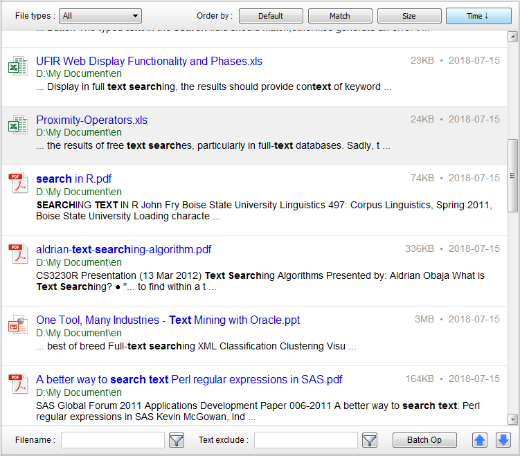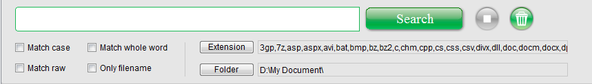 Sie sind Suchoptionen unter der Suchleiste. TextSeek führt eine zeichenweise Suche durch, sodass Sie nach "fe" suchen können, um "verfeinert" zu finden. Wenn Sie nach Dokumenten suchen möchten, in denen mehrere Wörter gleichzeitig vorkommen, trennen Sie diese bitte durch Leerzeichen; Wenn Sie nach mehreren Wörtern suchen möchten, trennen Sie diese bitte mit dem Schlüsselwort "or"; wenn Sie nach regulären Ausdrücken suchen möchten, verwenden Sie bitte das Schlüsselwort "re:" am Anfang (klicken Sie hier um mehr zu erfahren); Wenn Sie nach Dokumenten suchen möchten, die mit bestimmten Zeichen beginnen, beginnen Sie mit dem Schlüsselwort "pr:" ; Wenn Sie nach einer Phrase suchen möchten, die aus mehr als zwei Wörtern besteht, können Sie Anführungszeichen verwenden (z. B. "go to"). Wenn Sie nach ganzen Wörtern suchen möchten, wählen Sie einfach "Ganzes Wort abgleichen". Wenn Sie den Originaltext (wie Leerzeichen oder Anführungszeichen) abgleichen möchten, wählen Sie einfach "Das Original abgleichen", genauso wie Sie in Notepad suchen. Wenn Sie nur den Dateinamen abgleichen möchten, wählen Sie einfach "Dateinamen abgleichen". Über die Schaltflächen "Erweiterung" und "Ordner" auf der rechten Seite können Sie die Suche nach der angegebenen Erweiterung und dem Suchpfad weiter anpassen.