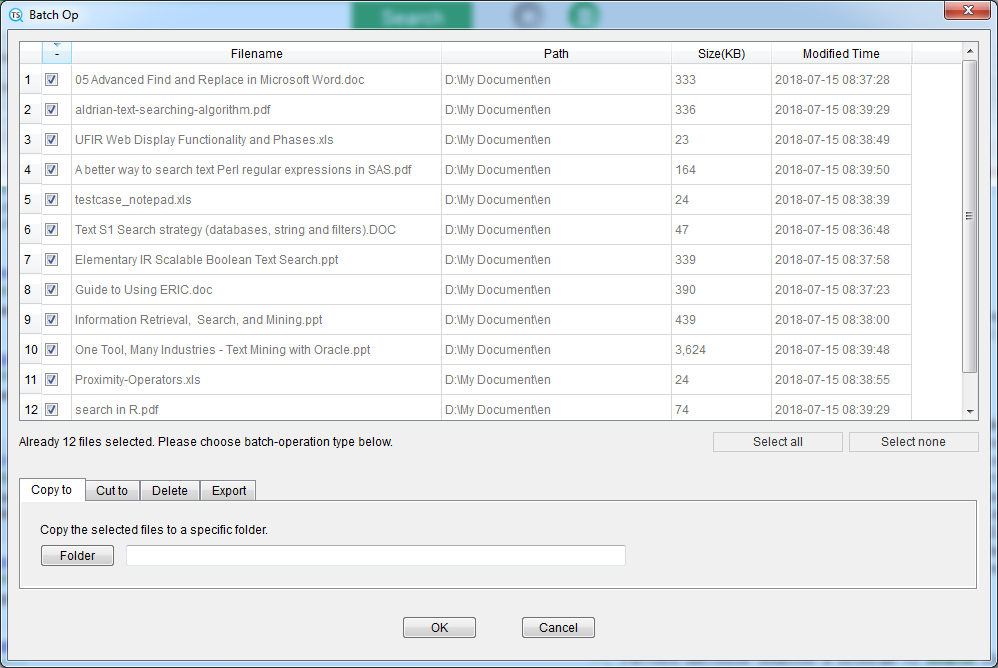 Wenn nach der Suche einige Suchergebnisse vorhanden sind, klicken Sie auf die Schaltfläche "Batch Op", um alle Suchergebnisse, die die Bedingungen erfüllen, stapelweise zu verarbeiten. Im Popup-Fenster können Sie alle relevanten Dateien kopieren und in das angegebene Verzeichnis ausschneiden oder alle löschen oder alle Suchergebnisse exportieren.