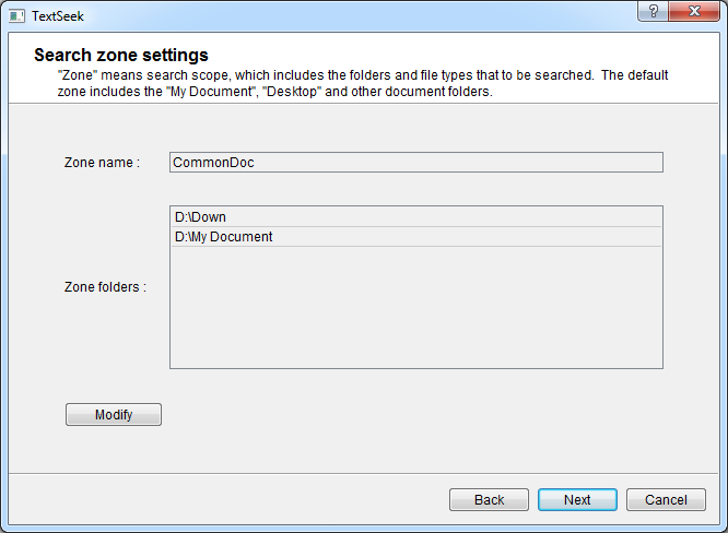 Zone bedeutet Suchbereich, der die zu durchsuchenden Ordner und Dateitypen umfasst. TextSeek legt auf intelligente Weise eine Standardzone für Sie fest. Wenn Sie die Zone ändern möchten, klicken Sie auf "Bearbeiten" (klicken Sie hier um mehr zu sehen). Um die Zone zu bestätigen, klicken Sie auf "Weiter".