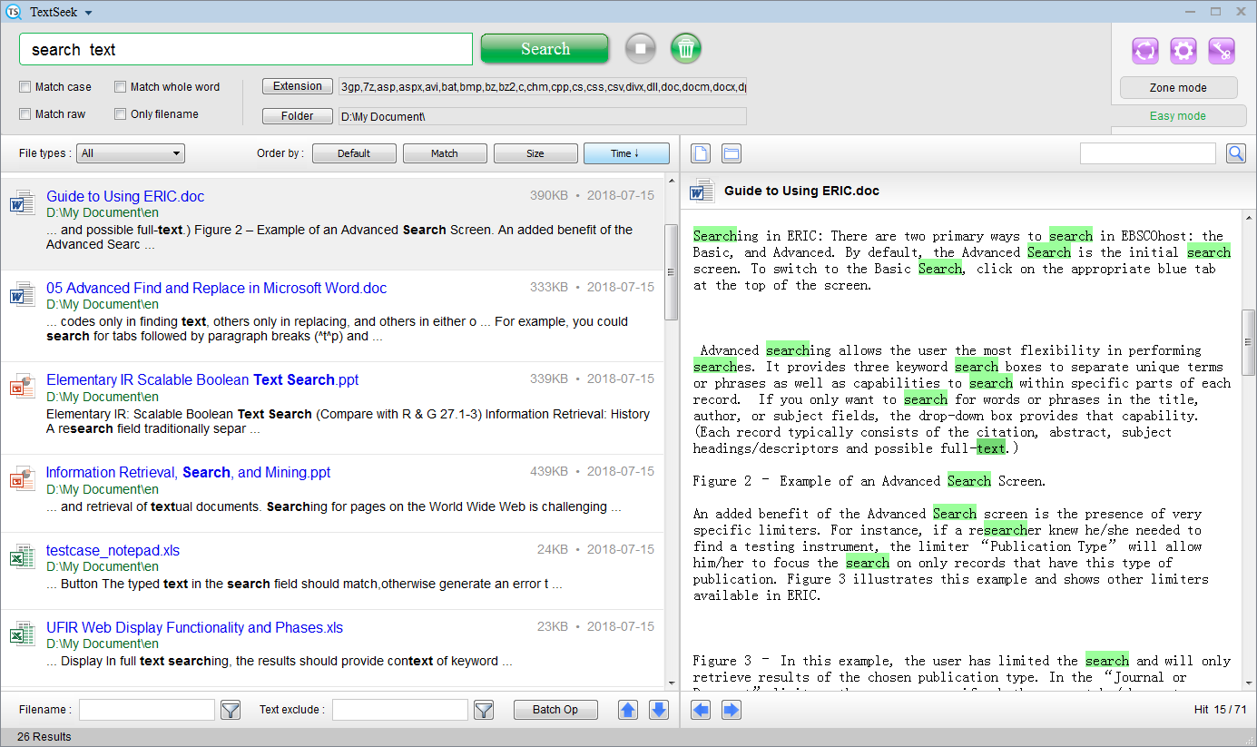 Der einfache Modus wird für Ordner außerhalb der Zone oder für häufig geänderte Suchbereiche verwendet. Dies ist der temporäre Nutzungsmodus. In diesem Modus werden die Dokumente erst gescannt, wenn Sie auf die Suchschaltfläche klicken, sodass die Suche langsamer ist. und es werden die Suchergebnisse angezeigt, sobald ein neues Ergebnis gefunden wird. Die Suche wird fortgesetzt, bis Sie auf die Stopp-Schaltfläche klicken oder alle Dokumente im Zielordner gescannt wurden.