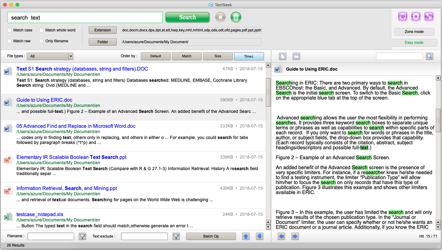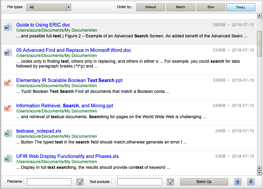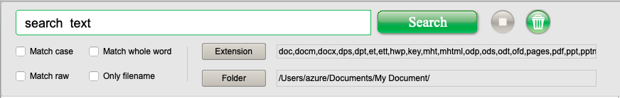 Sie sind Suchoptionen unter der Suchleiste. TextSeek führt eine zeichenweise Suche durch, sodass Sie nach "fe" suchen können, um "verfeinert" zu finden. Wenn Sie nach Dokumenten suchen möchten, in denen mehrere Wörter gleichzeitig vorkommen, trennen Sie diese bitte durch Leerzeichen; Wenn Sie nach mehreren Wörtern suchen möchten, trennen Sie diese bitte mit dem Schlüsselwort "or"; wenn Sie nach regulären Ausdrücken suchen möchten, verwenden Sie bitte das Schlüsselwort "re:" am Anfang (klicken Sie hier um mehr zu erfahren); Wenn Sie nach Dokumenten suchen möchten, die mit bestimmten Zeichen beginnen, beginnen Sie mit dem Schlüsselwort "pr:" ; Wenn Sie nach einer Phrase suchen möchten, die aus mehr als zwei Wörtern besteht, können Sie Anführungszeichen verwenden (z. B. "go to"). Wenn Sie nach ganzen Wörtern suchen möchten, wählen Sie einfach "Ganzes Wort abgleichen". Wenn Sie den Originaltext (wie Leerzeichen oder Anführungszeichen) abgleichen möchten, wählen Sie einfach "Das Original abgleichen", genauso wie Sie in Notepad suchen. Wenn Sie nur den Dateinamen abgleichen möchten, wählen Sie einfach "Dateinamen abgleichen". Über die Schaltflächen "Erweiterung" und "Ordner" auf der rechten Seite können Sie die Suche nach der angegebenen Erweiterung und dem Suchpfad weiter anpassen.