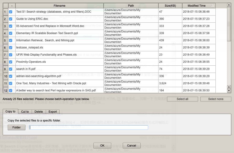 Wenn nach der Suche einige Suchergebnisse vorhanden sind, klicken Sie auf die Schaltfläche "Batch Op", um alle Suchergebnisse, die die Bedingungen erfüllen, stapelweise zu verarbeiten. Im Popup-Fenster können Sie alle relevanten Dateien kopieren und in das angegebene Verzeichnis ausschneiden oder alle löschen oder alle Suchergebnisse exportieren.