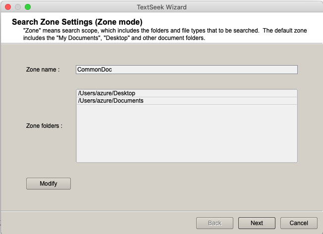 Zone bedeutet Suchbereich, der die zu durchsuchenden Ordner und Dateitypen umfasst. TextSeek legt auf intelligente Weise eine Standardzone für Sie fest. Wenn Sie die Zone ändern möchten, klicken Sie auf "Bearbeiten" (klicken Sie hier um mehr zu sehen). Um die Zone zu bestätigen, klicken Sie auf "Weiter".