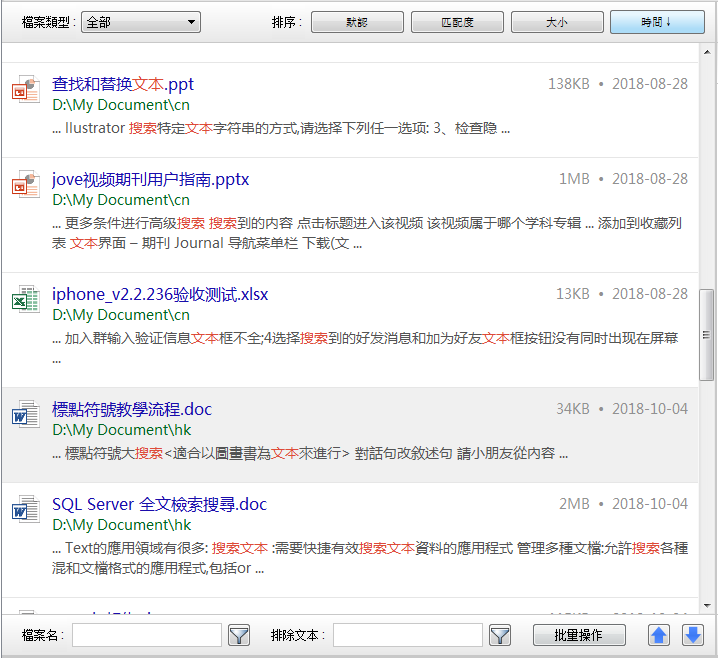 (4) 右下角:“批量處理”按鈕可以批量處理搜索出來的文檔(拷貝、剪切、刪除和匯出)。上箭頭和下箭頭可用來逐項流覽搜到的檔。