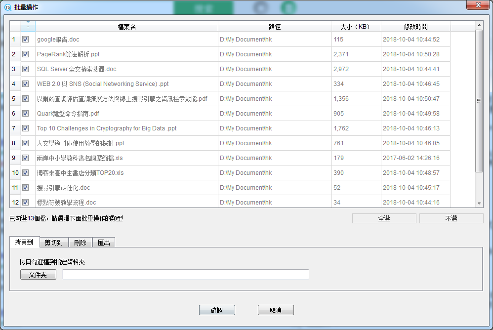 搜索後,如果有搜索結果,點擊“批量處理”按鈕,可以對滿足條件的所有搜索結果進行批次處理。在彈出的視窗中,你可將相關檔都拷貝、剪切到指定目錄,也可以都刪除,或者匯出所有搜索結果資訊。