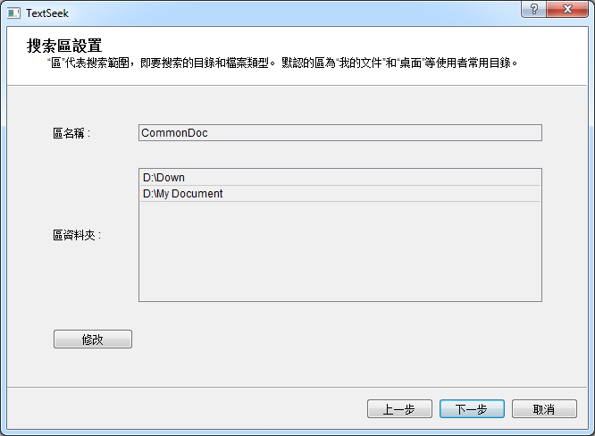 區表示搜索範圍,包括要搜索的資料夾和檔案類型。 TextSeek會智能地為你設置默認區。 如果你想更改區,按一下“編輯”(按一下此處可瞭解更多)。 如果確認好了區,按一下“下一步”。