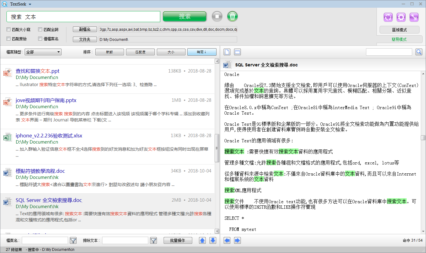 搜索條下方是基本的搜索選項。TextSeek的搜索是字元級的,因此你搜索“fi”就能匹配到“refined”。你想搜索多個詞同時出現的文檔,請用空格分開;如果你想搜索多個詞任意一個出現,請用關鍵字“or”分開;如果你想搜索規則運算式,請用關鍵字“re:”開頭(點擊此處可瞭解更多);如果你想搜索以特定字元開頭的文檔,請用關鍵字“pr:”開頭;如果你要搜索兩個詞以上組成的短語,可以用引號(例如“go to”)。 如果你想整單詞搜索(主要用在英文),勾選“匹配全詞”即可;如果你要直接匹配原始文本(如關鍵字包括空格和引號),勾選“匹配原始”即可,像你在Notepad裡面搜索一樣;如果你只想匹配檔案名不想匹配內容,勾選“匹配檔案名”。右邊的“副檔名”和“資料夾”按鈕,可以讓你進一步定制化搜索指定的副檔名和搜索路徑。