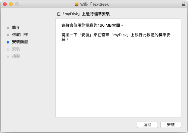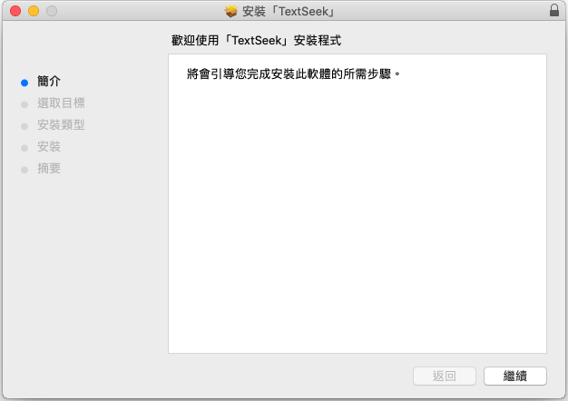 Mac系統下僅有安裝版,根據您系統版本選擇正確的安裝檔,Catalina版本及之後的選OS X≥10.15版。運行安裝檔,依次點擊後TextSeek將安裝在你的電腦上。點擊“啟動台”的TextSeek圖示或者通過Finder打開“應用程式”目錄下的TextSeek圖示,即可啟動。