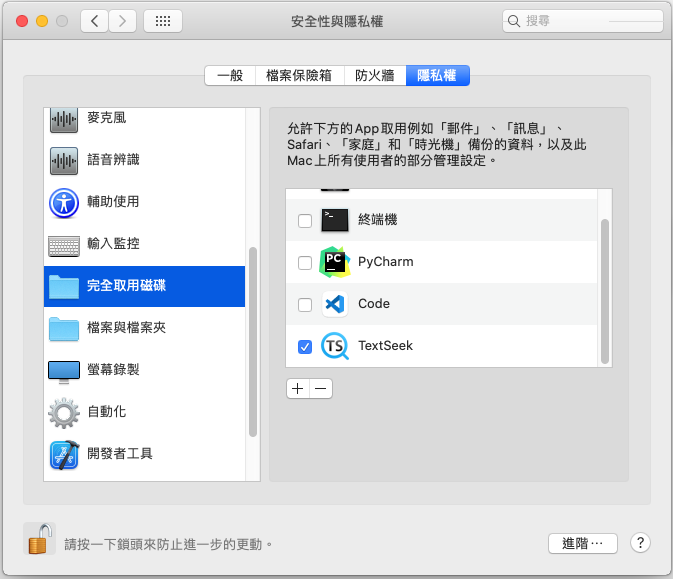 6、TextSeek需要訪問本地磁片的許可權才能工作。打開系統偏好設置 -> 安全性和隱私權 -> 隱私權 -> 完全取用磁碟 -> TextSeek打上勾。如果不可編輯,點擊左下角的鎖形圖示並輸入密碼即可解鎖。