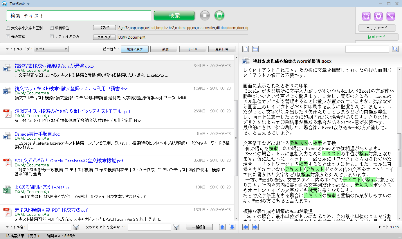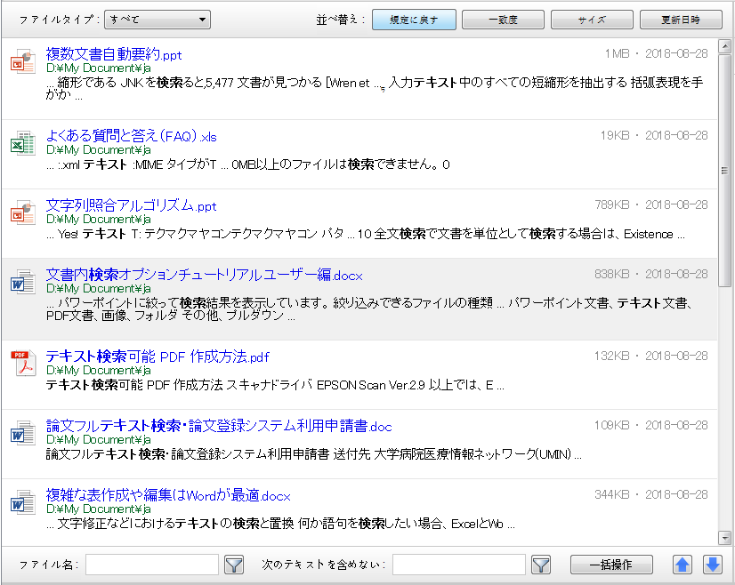左側は検索結果領域です。各ブロックはキーワード付きの1つのファイルを表します。結果リンクをシングルクリックして右側にドキュメントプレビューを表示するか、結果リンクをダブルクリックしてドキュメントを開くことができます。検索結果バーの上部と下部には、検索結果を処理するためのさまざまなツールがあります。
