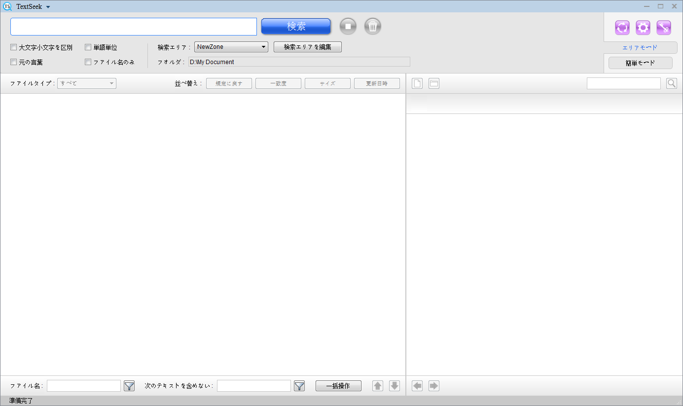 TextSeekには、2つの検索モード(エリアモードと簡単モード)があります。 右上のタブボタンをクリックするとモードが切り替わります。