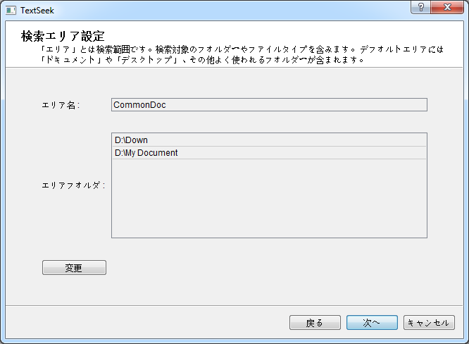 エリアを設定します(「エリア」とは検索範囲です。検索対象のフォルダーやファイルタイプを含みます)。 ここでTextSeek規定のエリアを設定します。 エリアを変更する場合は、「編集」をクリックしてください(詳細はこちらをクリックしてください)。エリア設定後、「次へ」をクリックします。