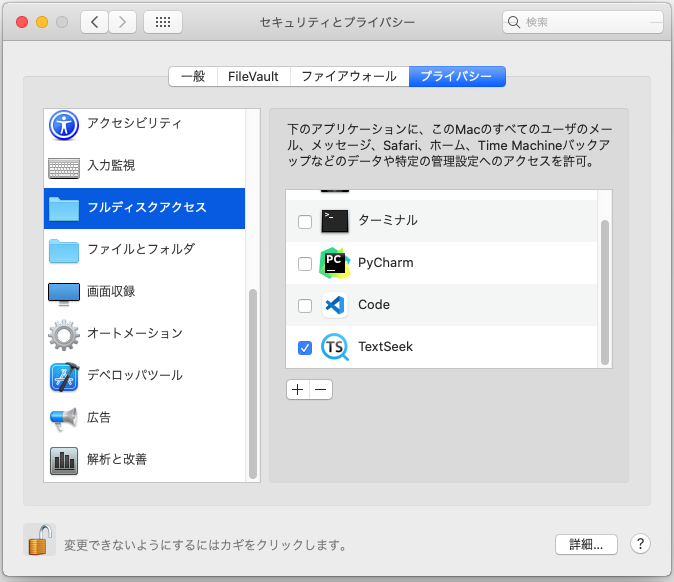 6. TextSeekが機能するには、ディスクアクセスに許可が必要です。 [システム環境設定]-> [セキュリティとプライバシー]-> [プライバシー]-> [フルディスクアクセス]-> [TextSeek]を開き、確認します。 編集できない場合は、左下隅にあるロックアイコンをクリックし、パスワードを入力してロックを解除します。
