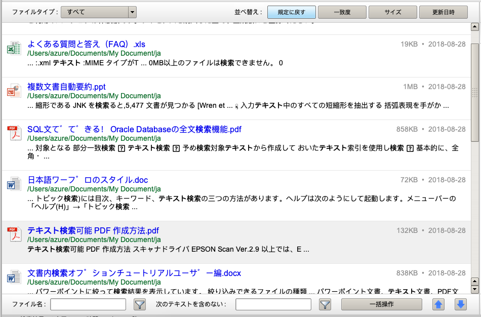 左側は検索結果領域です。各ブロックはキーワード付きの1つのファイルを表します。結果リンクをシングルクリックして右側にドキュメントプレビューを表示するか、結果リンクをダブルクリックしてドキュメントを開くことができます。検索結果バーの上部と下部には、検索結果を処理するためのさまざまなツールがあります。