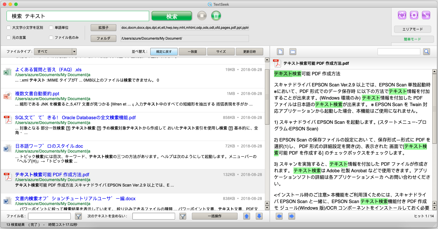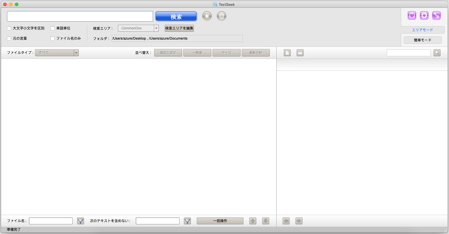 TextSeekには、2つの検索モード(エリアモードと簡単モード)があります。 右上のタブボタンをクリックするとモードが切り替わります。