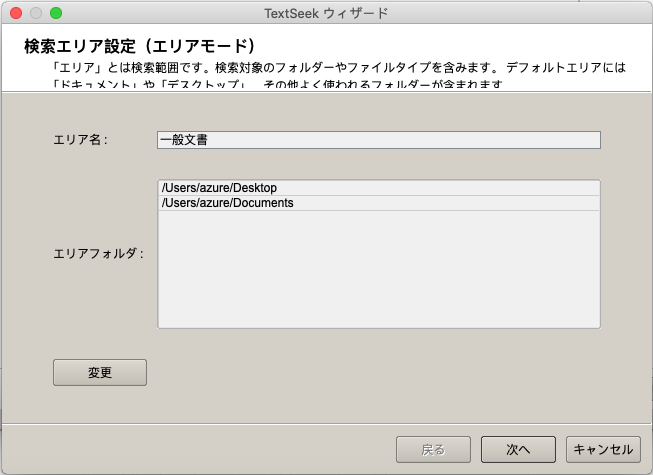 エリアを設定します(「エリア」とは検索範囲です。検索対象のフォルダーやファイルタイプを含みます)。 ここでTextSeek規定のエリアを設定します。 エリアを変更する場合は、「編集」をクリックしてください(詳細はこちらをクリックしてください)。エリア設定後、「次へ」をクリックします。