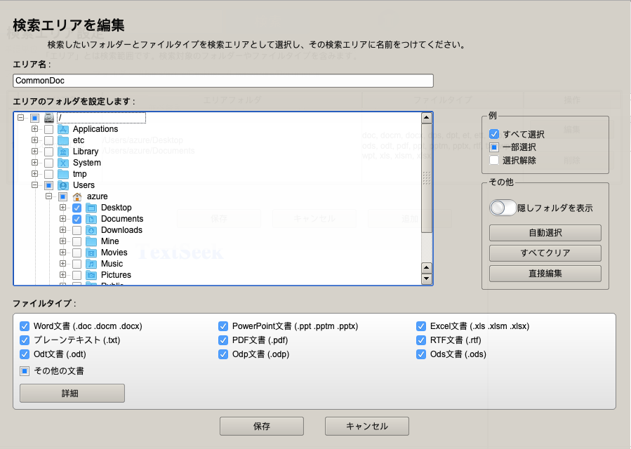 これが1つのエリアの設定ページです。 エリア名を割り当てたり、検索するフォルダとファイルタイプを確認する(「隠しフォルダを表示」をクリックするとすべてのフォルダが表示されます)。 ここでは複数のフォルダをチェックできます。右側には「自動選択」ボタンがあり、頻繁に使用するフォルダをインテリジェントにチェックするのにも役立ちます。必要なファイルタイプが一覧にない場合は、それを追加するため「詳細」をクリックします。