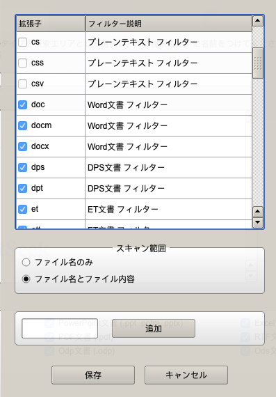 次は、ファイルタイプの詳細設定ページです。 最初の表はファイル拡張子表です。1つの行がファイル拡張子1つに割り当てられます。 行を1つクリックし、「ファイル名のみ」または「ファイル名とファイルの内容」をスキャンする範囲として選択できます。 新しいファイル拡張子を追加するには、その拡張子を入力して「追加」ボタンを押します。 ユーザーが追加したファイルは生のテキストファイルとして解析されます。 次に「保存」をクリックしてファイルタイプの変更を保存します。