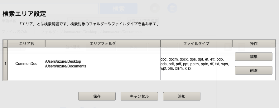 エリアモードでは、検索バーの下に「エリアエディタ」ボタンがあります。 「エリアエディタ」ウィンドウを開き、すべてのエリア情報が大きな表に含まれています。1行にエリアが1つ含まれます(デフォルトの行は、ウィザードページで設定したエリアです)。エリアを変更するには「編集」をクリックします。新しいエリアを追加するには「追加」をクリックします。 エリアを設定したら、「保存」をクリックしてエリアのスキャンを実行します。