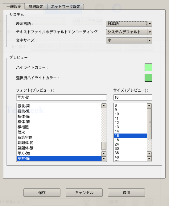 ここには「設定」ウィンドウがあります。 最初のタブは「一般設定」です。表示言語と規定のエンコーディング(エンコード検出が困難なテキストファイルの解析に使います)を設定できます。 それから、その下でプレビューウィンドウのハイライトカラーを設定できます。 下部では、プレビューのフォント形式とフォントサイズを変更できます。