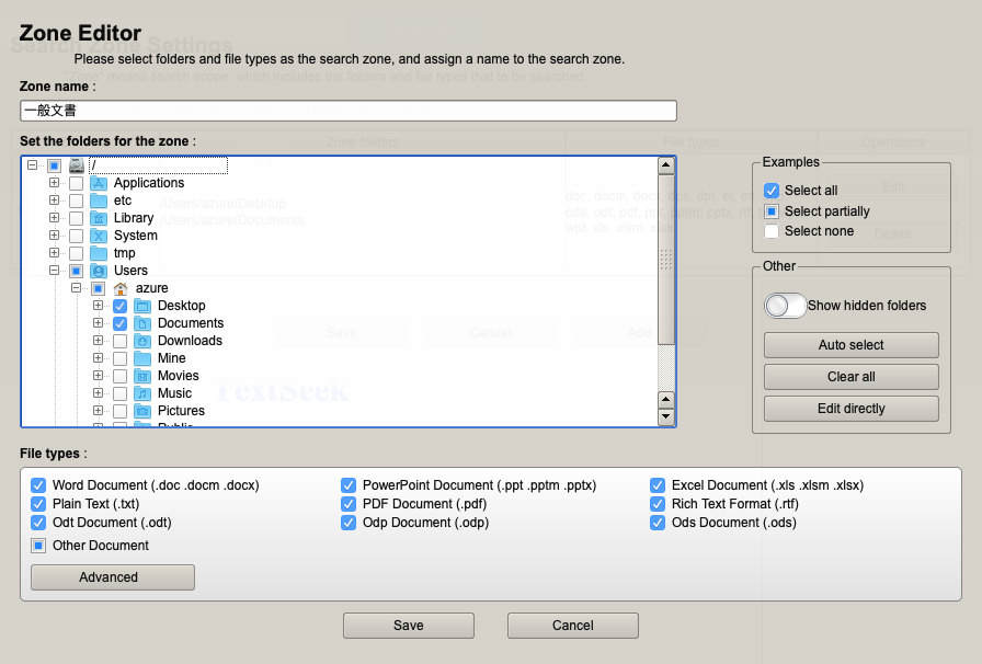다음은 하나의 영역에 대한 설정 페이지입니다. 영역 이름을 지정하고 검색할 폴더 및 파일 형식을 확인할 수 있습니다("숨김 폴더 표시"를 클릭하여 모든 폴더를 표시할 수 있음). 여기에서 여러 폴더를 확인할 수 있으며 오른쪽에 "자동 선택" 버튼이 있어 자주 사용하는 폴더를 지능적으로 확인할 수도 있습니다. 필요한 파일 형식이 목록에 없는 경우 추가 조작을 위해 "고급"을 클릭합니다.