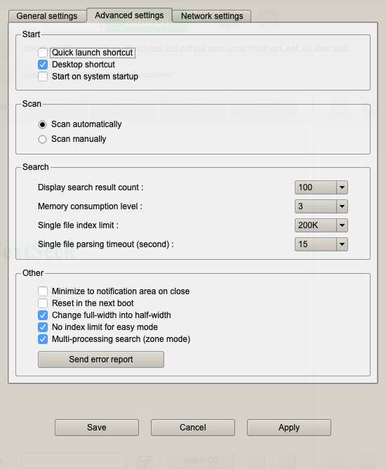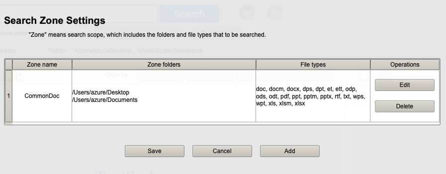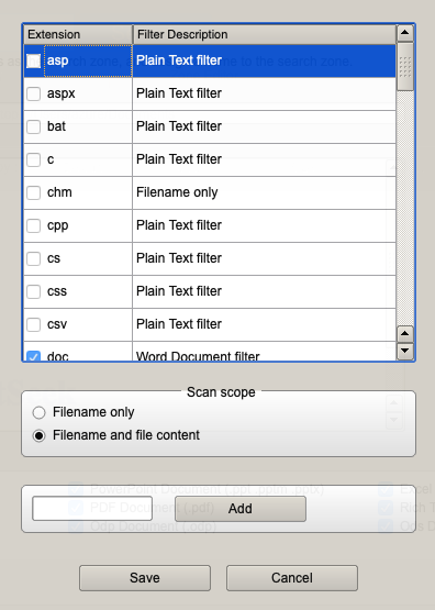 파일 형식에 대한 고급 설정 페이지의 경우 상단 테이블은 파일 확장자 테이블이며 한 줄은 파일 확장자의 한 종류를 의미합니다. 한 줄을 클릭하고 스캔 범위("파일 이름만" 또는 "파일 이름 및 파일 내용")를 선택하기만 하면 됩니다. 아래에서 새로운 확장 파일 형식을 추가할 수 있습니다. 파일 이름의 접미사를 입력하고 "추가" 버튼을 누르십시오. 사용자 추가 유형의 파일은 원시 텍스트 파일로 구문 분석됩니다. 그런 다음 "저장"을 클릭하여 파일 형식에 대한 변경 사항을 유지합니다.