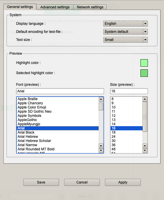 다음은 "설정" 창입니다. 첫 번째 탭 페이지는 "일반 설정"이며 표시 언어와 기본 인코딩(인코딩을 감지할 수 없는 텍스트 파일 구문 분석용)을 설정할 수 있습니다. 아래에서 미리보기 창의 하이라이트 색상을 설정할 수 있습니다. 하단에서 미리보기의 글꼴 종류 및 글꼴 크기를 변경할 수 있습니다.